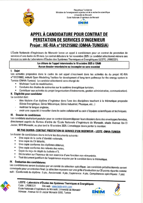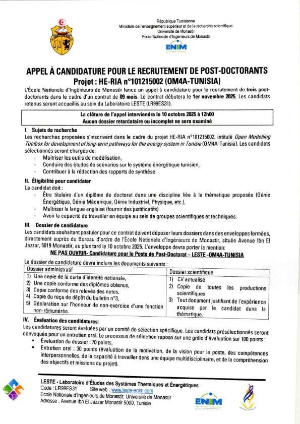 L’Ecole Nationale d’Ingénieurs de Monastir lance un appel à candidature pour le recrutement de  cinq Post-doctorants sur des contrats de 6 mois. Les contrats débuteront le 1er février 2025. Les Post-doctorants accueillis réaliseront leurs recherches au sein du Laboratoire d’Etudes des Systèmes Thermiques et énergétiques (LESTE, LR99ES31).